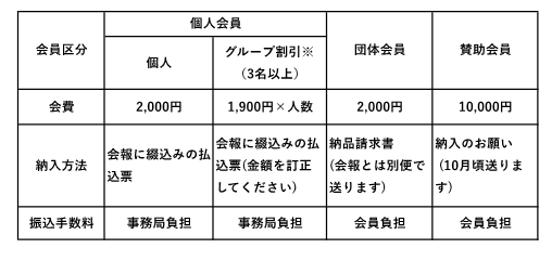 会費(年1回納入)の金額とその納入方法は会員の種類別に表のようになっています。速やかな会費納入にご協力下さい。